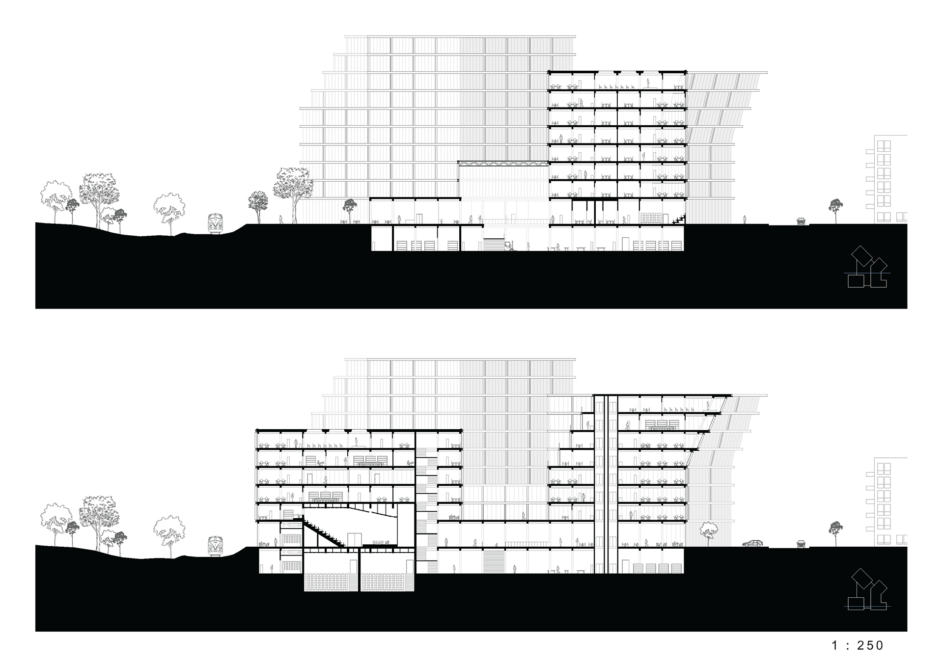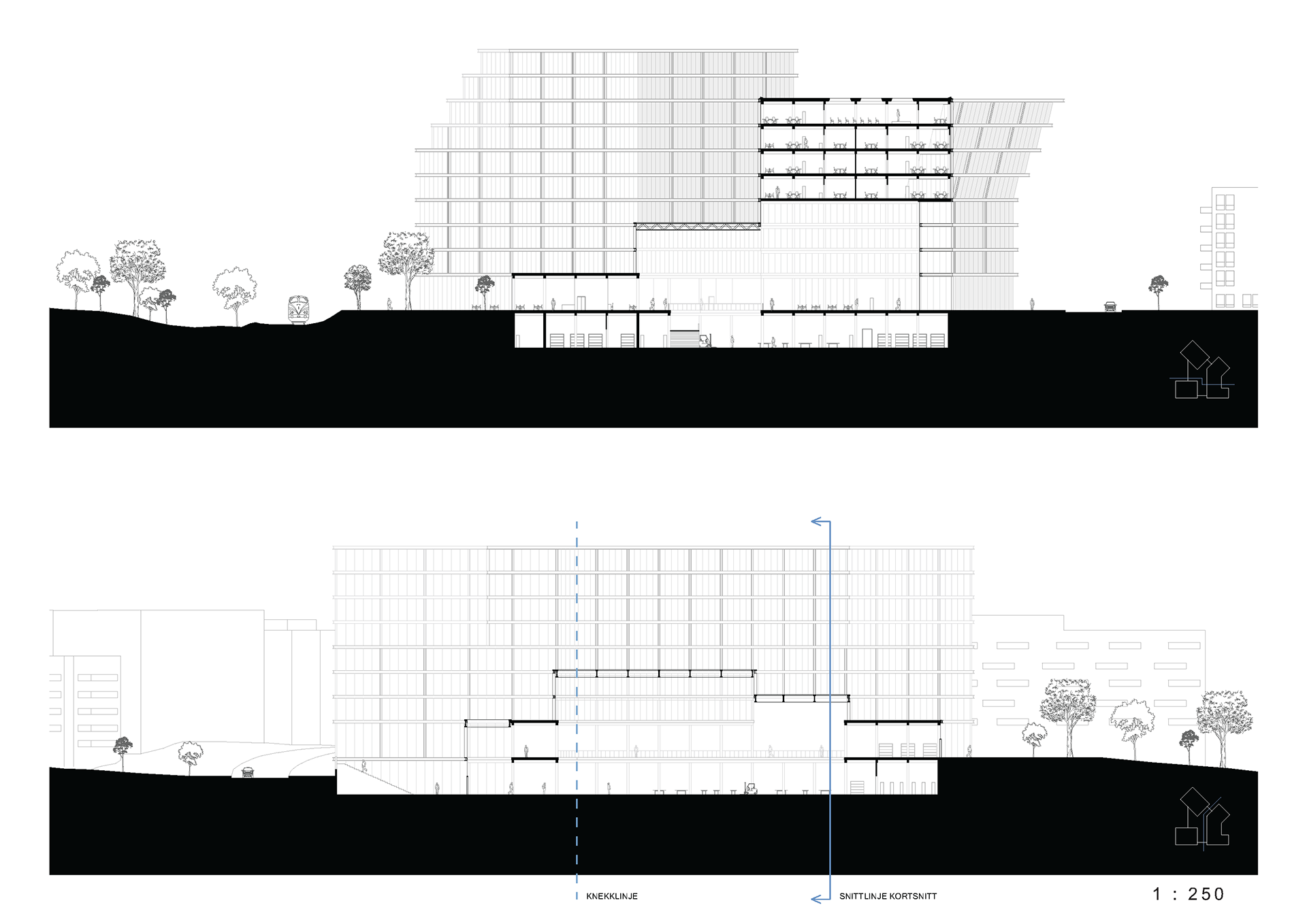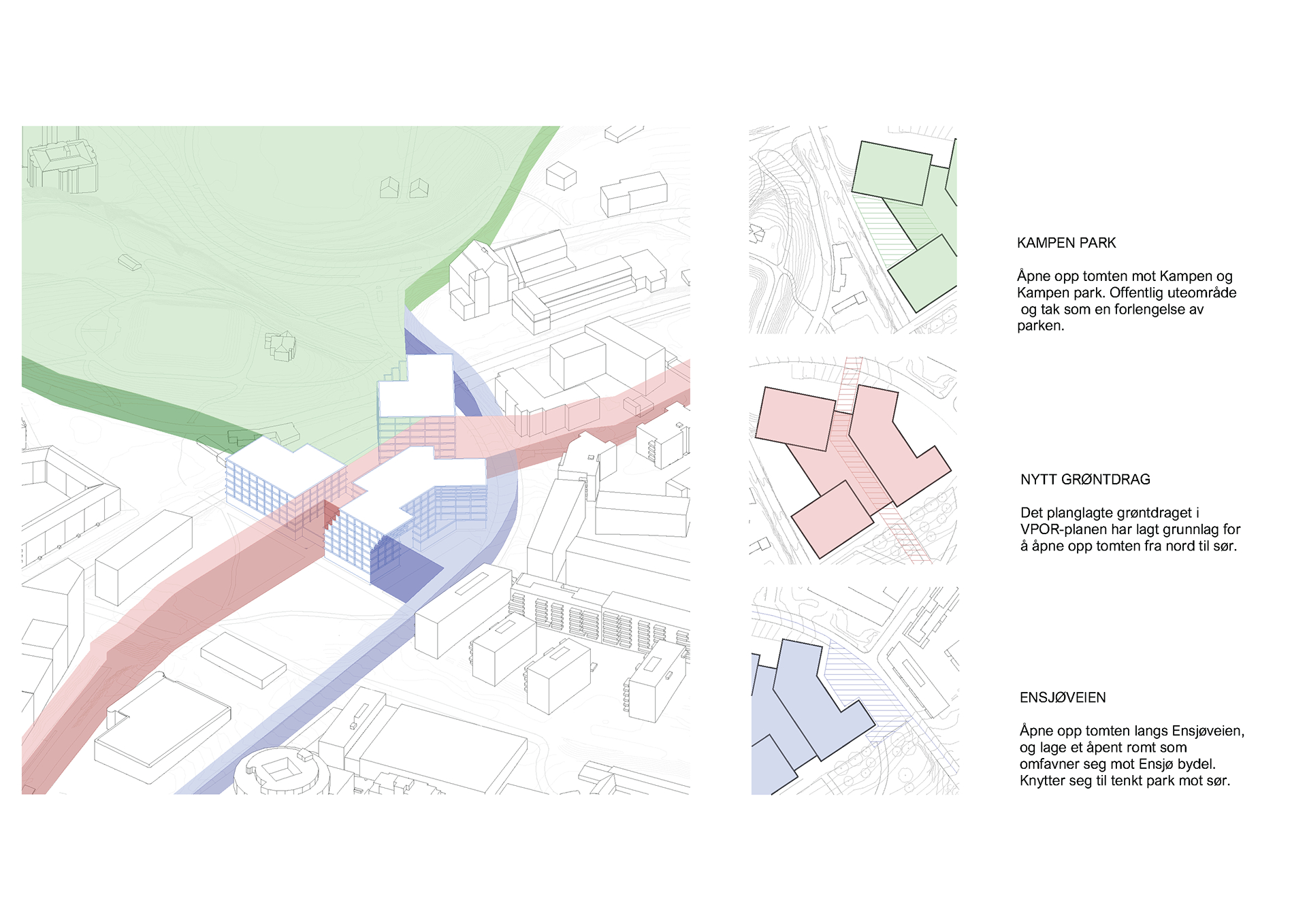 The project explores how a new NRK headquarters at Ensjø can open up the site and establish new connections between Kampen Park, Ensjøveien, and the planned green axis running through the area. A public base with audience-oriented functions forms the foundation for three distinct volumes that organize TV, radio, and administrative programs around new urban spaces.